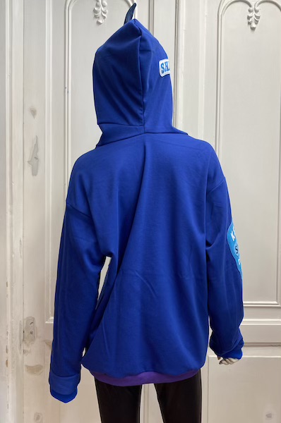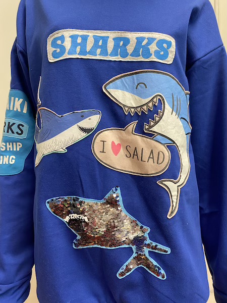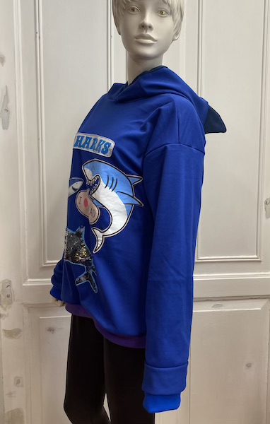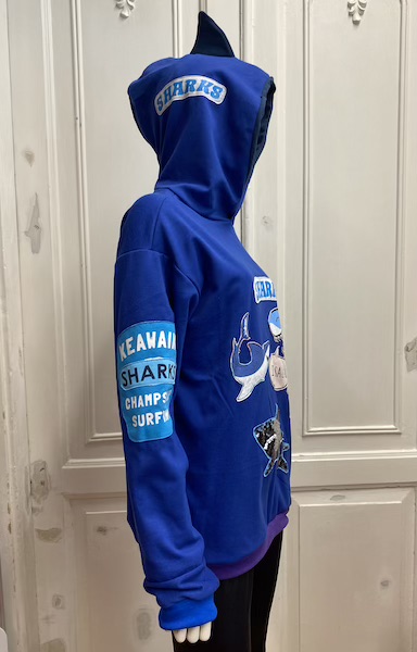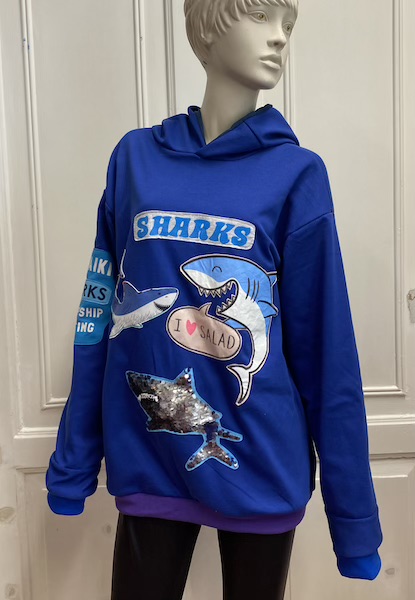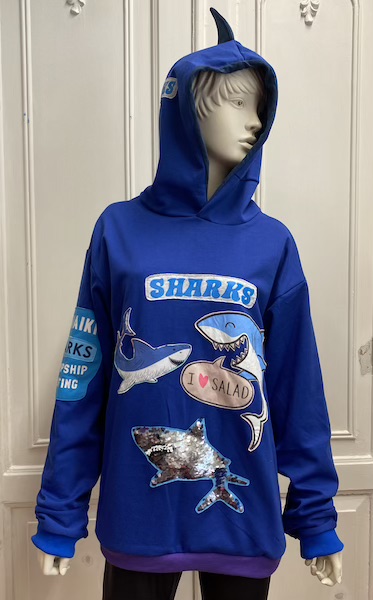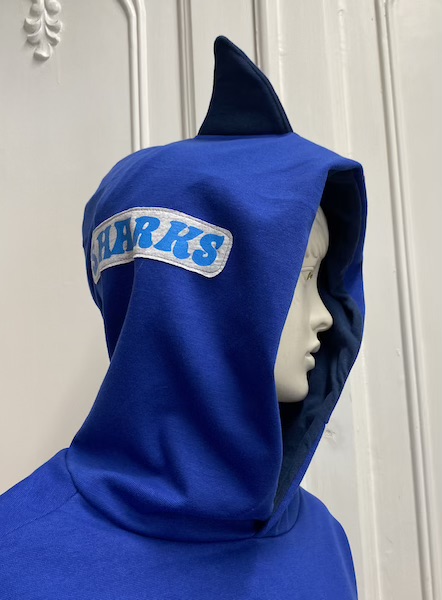 Mieti miten työkaverit kahvihuoneessa reagoisivat, jos nousisit tappajahaina pöydän alta? Tai opettaja, mitä hän sanoisi, jos ilmaantuisitkin pulpettisi alta kuin klassinen valkohai konsanaan? Naapuriakin voi hämmentää hiipimällä evä ojossa pensasaidan takana. Hairönsy on siis ennen kaikkea hilpeä pukine, suorastaan riemastuttava. Se syntyi lasten vanhoista T-paidoista, yhdestä erityisen suuresta yökkäristä ja vuorimateriaalina on maailman pehmoisin ja pöyristyttävin sammakkotrikoo. Haiasussa kelpaa hiiviskellä niin töissä kuin koulutielläkin ja miksei siinä voisi vaikka vihillekin mennä, ihan hyvin voisi. Korvamato saattaa tulla kaupan päälle. Dun dun dun dun dun dun…